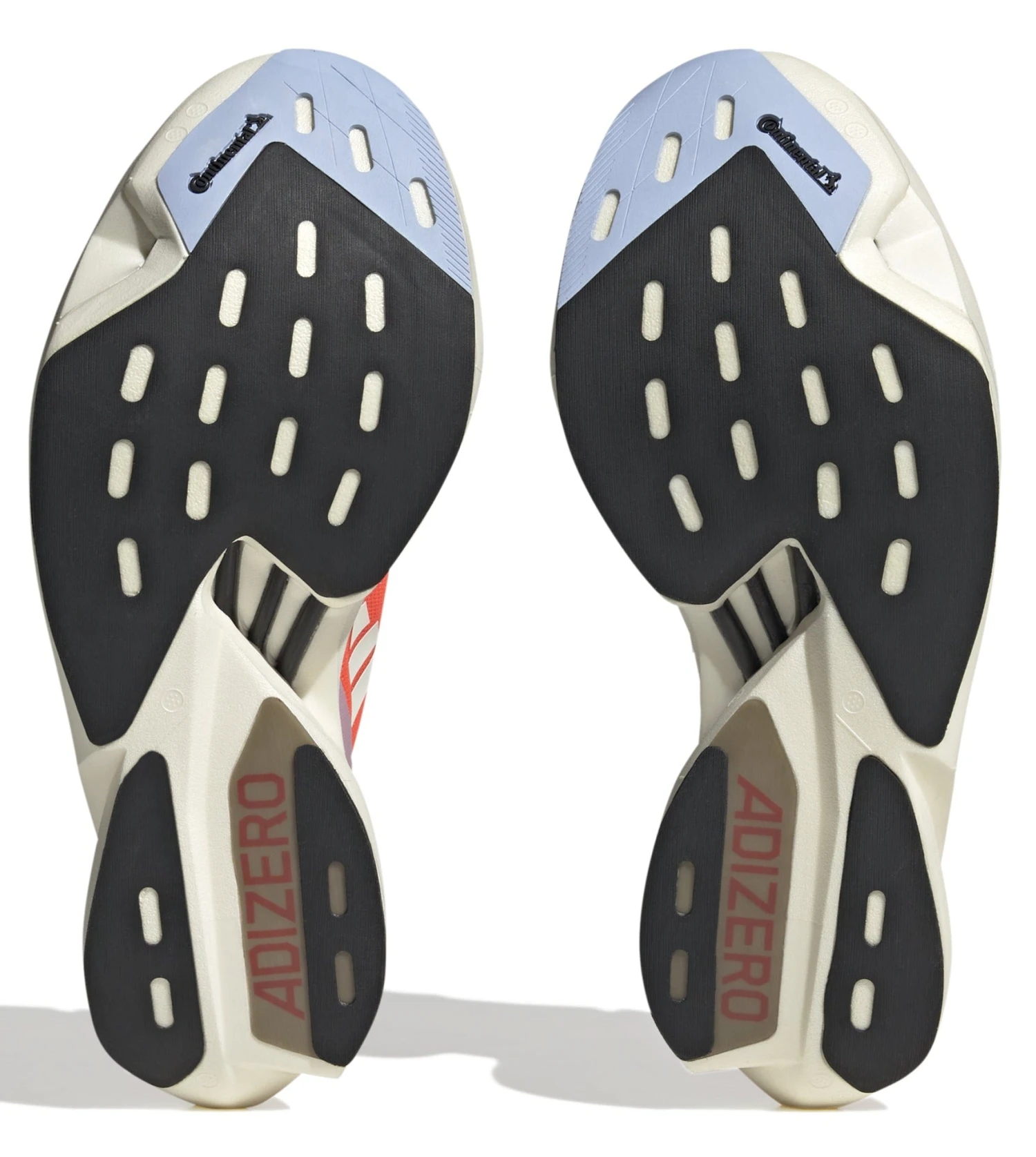 The Adidas Adios Pro 3 is the ultimate road racing shoe for long-distance athletes looking to take their performance up a notch. The midsole is made up of 2 layers of durable Lightstrike Pro foam for cushion with optimized ENERGYRODS 2.0 embedded inside. This combination is designed to give runners a perfectly calibrated stiffness and energy return come race day. The upper has been revamped providing support where you need it most, and put together with lightweight materials. Underneath, Continental Rubber comprises the outsole to provide superior traction to help you take on turns at a fast pace.Â